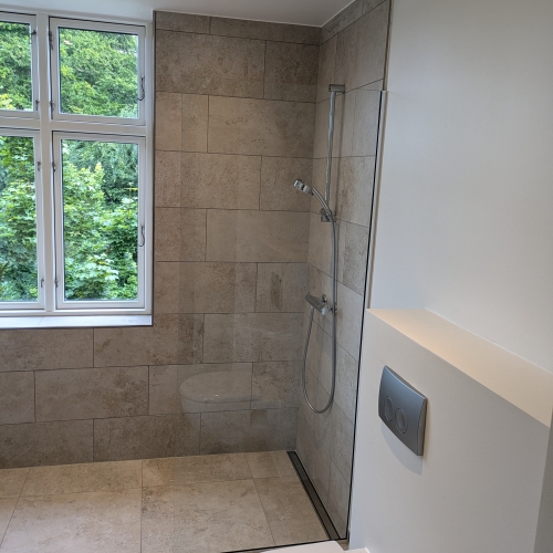 Hos CASSØE GLAS ApS leverer vi bruseglas i specialmål, så løsningen passer perfekt – også i badeværelser med skæve vægge, skrå lofter eller unikke mål. Vi kan blandt andet tilpasse løsninger med både faste glaspartier og glasdør, så du får en praktisk og elegant bruseløsning.